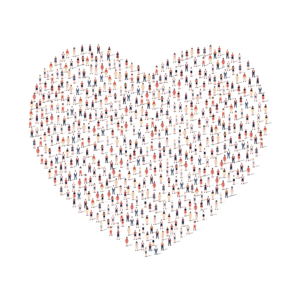 Large group of people different silhouette crowded together in heart shape isolated on white background. Vector illustration